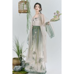 Violet Mountain's spaghetti strape top is made of soft, breathable cotton fabric that is lightweight and heat-resistant, with delicate purple prints resembling misty clouds. Long beizi is crafted from semi-transparent, ultra-thin material, with every stitch reflecting a deep respect for tradition. The pleated skirt features a gradient design that shimmers under the light, offering a silky, cool, and airy wearing experience.